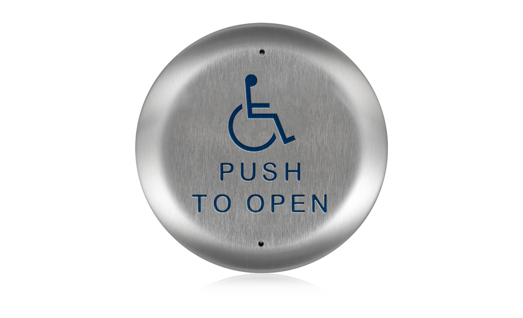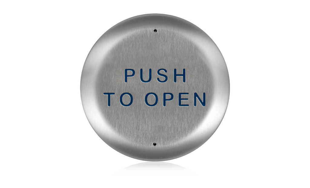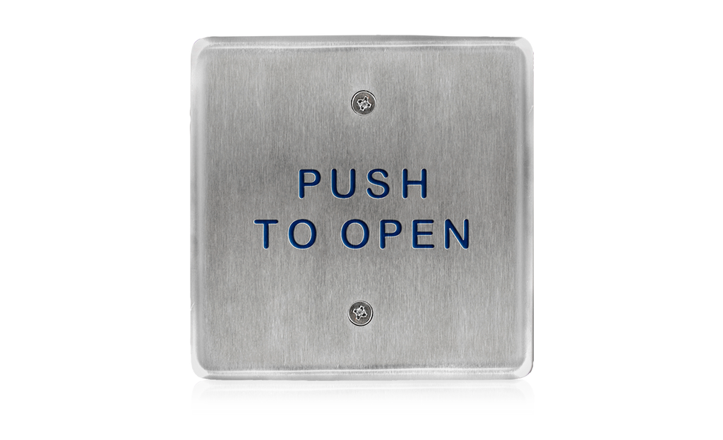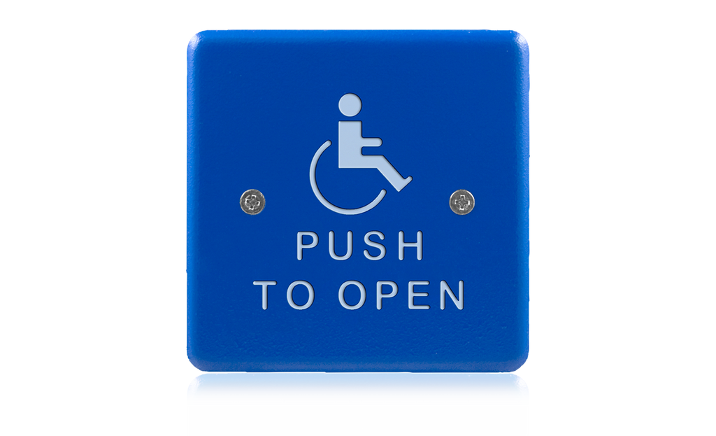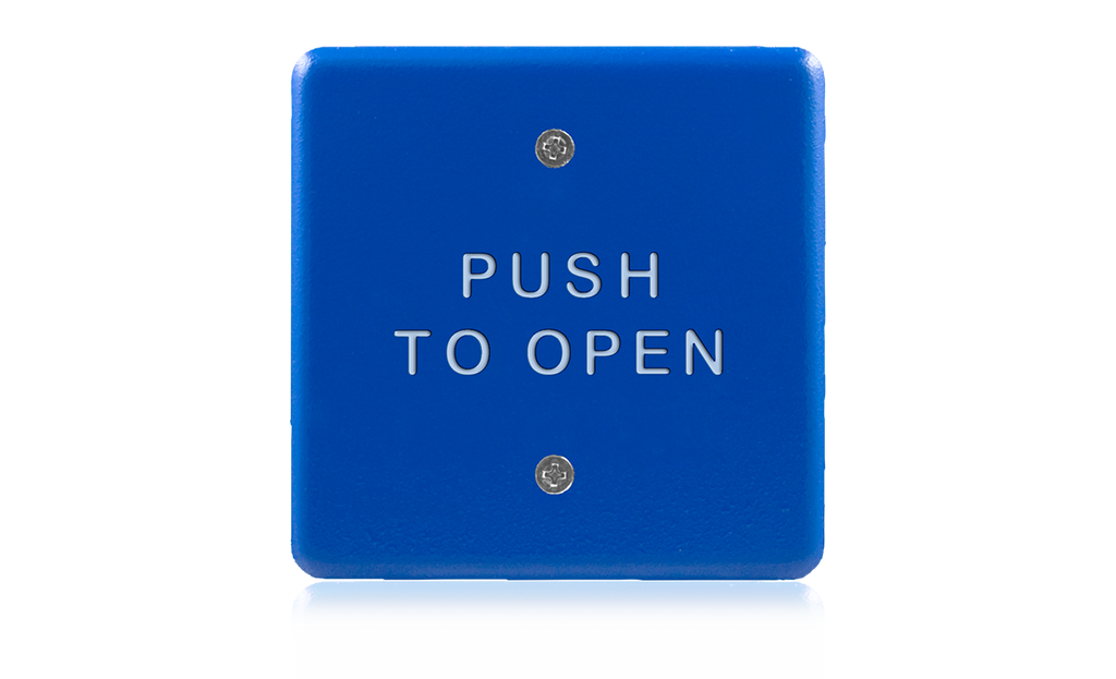 4.5 inch square, “push to open” text & handicap logo, blue faceplate with white print